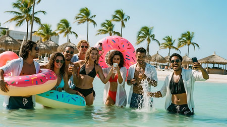Friends taking a selfie on a tropical beach. Summer vacation and travel concept. Design for social media, travel blog, and holiday banner