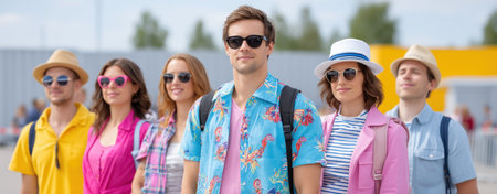 A group of tourists with colorful summer attire waiting at gate with backpacks, enjoying bright day with sunglasses and hats