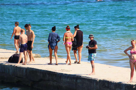 Balaklava. Republic Of Crimea. Russia. August 12, 2018. Many tourists sunbathe on the rocky shore and swim in the waters of the Black sea.