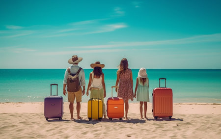 A cheerful family with a suitcase ready for holiday fun under the sun.