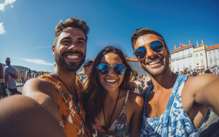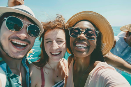 Friends enjoy a sunny day at the beach, smiling and laughing as they capture a fun moment together. The blue sky complements their joyful spirit and summer vibe. White sand. Generative AI.