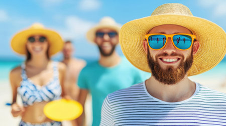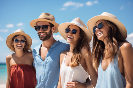 Group of friends is smiling on a sunny beach while enjoying their summer vacation