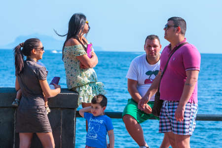 ARRECIFE, SPAIN - APRIL 8: beach with tourists in summer on April 8,2012 in Arrecife, Spain. The beach El Reducto is granted a blue flag by the European Union. This seal for cleanness must renewed yearly.