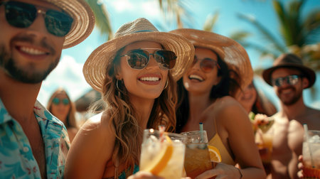 Group of friends drinking cocktails at party on luxury resort. Summer vacation concept.