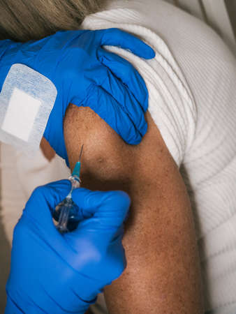 Nurse sticking adhesive bandage on shoulder of patient after injecting vaccine against coronavirus