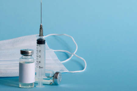 Vaccine bottle phial with no label on blue medical mask and medical syringe with injection needle. isolated on blue background. cure.