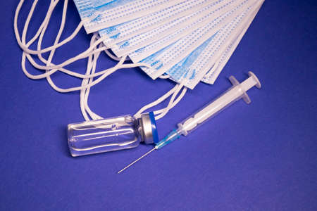 Vaccine bottle phial with no label and medical syringe with injection needle near pile of blue medical masks . isolated on blue background.