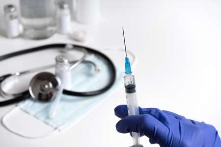 Covid-19 vaccination background on a white background, vaccine vial with syringe, blue gloves