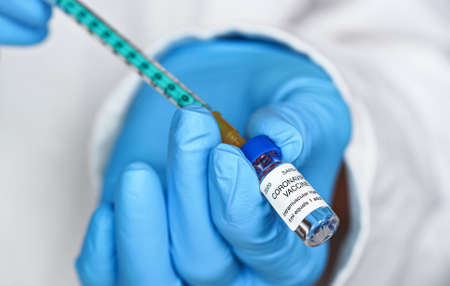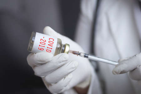 Doctor hands holding covid-19 vaccine preparing for vaccination of a patient