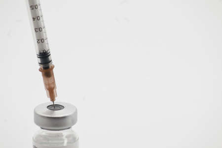syringe stuck in vaccine vial on white background