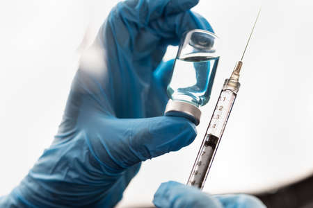 Vaccination against coronavirus. Ampoule with a vaccine. In the hands of a syringe for injection. Hands in rubber gloves. Close-up shot.