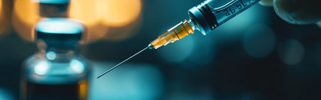 Closeup of vaccine bottle with syringe and needle for immunization on vintage medical background, medicine and drug concept