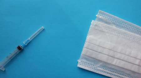 A syringe with a needle lies and a medical mask on a blue background. Vaccination. Coronavirus. The concept of medicine and immunity. Vaccination against viral infections. Flatly. Copy space.