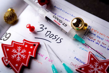 Covid Christmas vaccination campaign booster shot and jab concept in spanish language. Three syringes on calendar with Christmas decorations as a concept for the 3rd covid-19 vaccine dose during Christmas time.