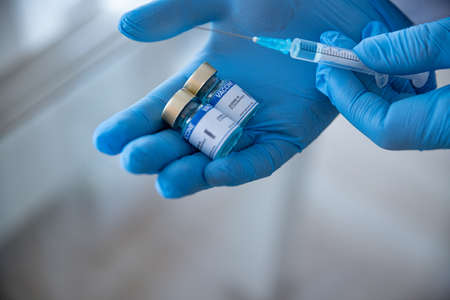 Hands of a doctor with a syringe and a vaccine. Blue latex gloves. Concept medicine and vaccine. Pandemic and vaccination.