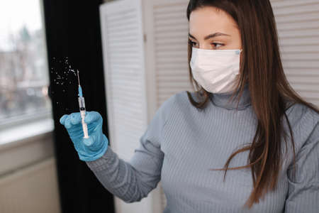 Vaccine in hands, female doctor holds syringe and bottle with covid19 vaccine for coronavirus cure. Concept of corona virus treatment, injection. Female in medical mask. Close up of hands