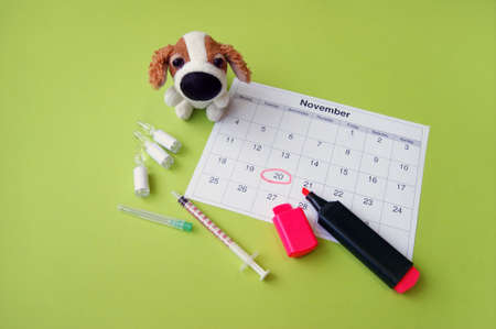 A syringe with ampoules, a soft toy a dog and a calendar with a marked date on light green background