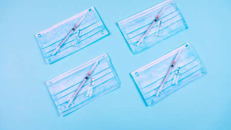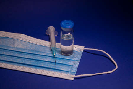 Vaccine bottle phial with no label on blue medical mask and medical syringe with injection needle. isolated on blue background. cure.