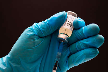 Calgary, Alberta. Canada. April 02, 2021. Health care worker with a Janssen or Johnson and johnson Vaccine and injection syringe.