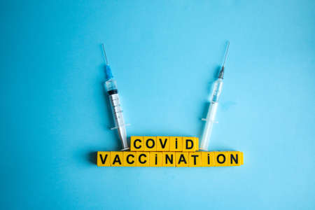 Coronavirus vaccine vials. Covid-19 vaccination with vaccine ampoules and syringes. Vaccine against the pandemic. Blue background. Stop Covid concept. Clinical trial.