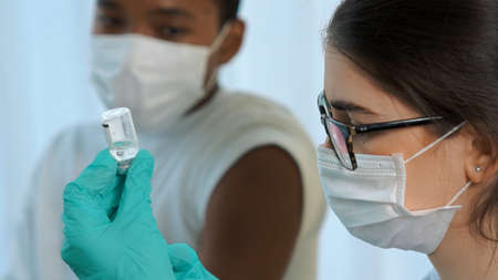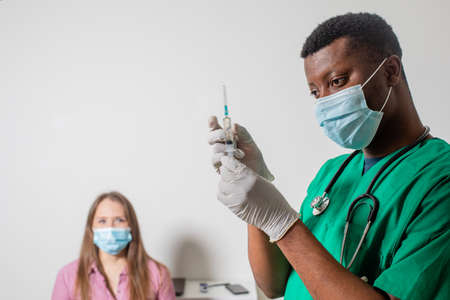 Female doctor or nurse wearing mask, gloves, and visor preparing to vaccinate coronavirus 19 to immunize African-American men.Concepts to prevent the spread of COVID-19.
