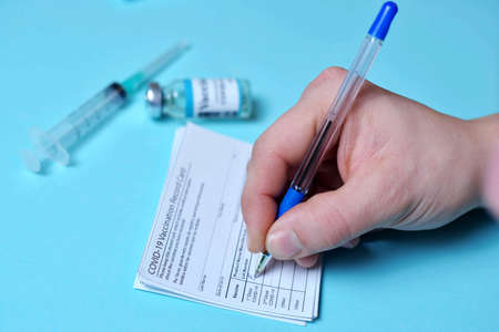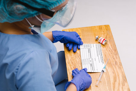 COVID-19 testing and vaccination forms on desk, doctor makes an entry in coronavirus vaccine record card, medical document in clinic. Concept of corona virus vaccination certificate and immunization.