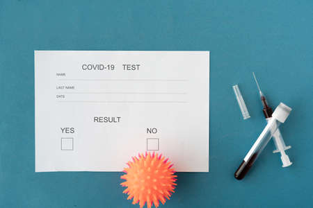 syringe and test tube with blood lie on a blue background, a sheet of paper with the test results on COVID-19