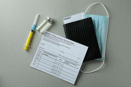 Travel in new normal. Passport, immunization record form, face mask , syringe and needle.