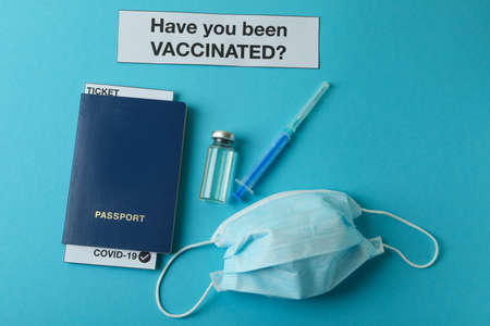 An international certificate of vaccination, a passport, a syringe, a vaccine dose vial and surgical masks, on a blue background. Protocols and requirements for travel