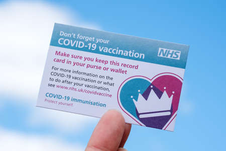 Manchester, United Kingdom-14 July, 2021: A close-up of a Covid-19 Vaccination record card
