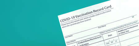 COVID-19 vaccination record card close up banner, copy space photo
