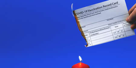 Person is do not want to go vaccinate, burns the COVID-19 vaccination record card, banner, concept of angry, photo