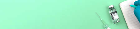 Vaccination medicine banner with white background and covid-19 vaccine, syringe, docotr in blue gloves and notebook, top view and copy space photo