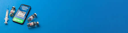 Covid-19 vaccine vial, vaccination record card, syringe, a pen on a blue background, copy space, close up. Coronavirus vaccination concept.