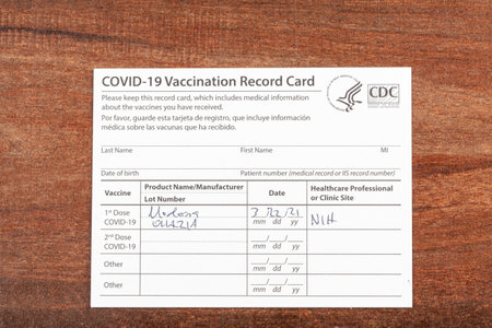 Bethesda, MD, USA 03-22-2021: a COVID 19 vaccination record card on a wooden desk. The card details the date, type and the dose number of administred vaccine and given to every person for record.