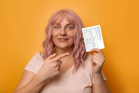 The close up photo of a smiling girl in the dress holding the toy plane and vaccine certification for the flight.