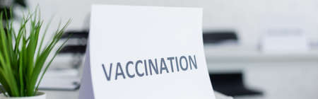 green potted plant near sign plate with vaccination lettering on desk in hospital, banner