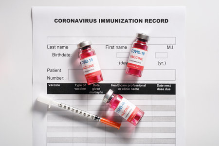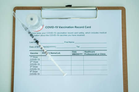 COVID-19 or coronavirus vaccine in a bottle and needle with the COVID-19 vaccination record document close up with copyspace.