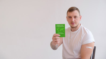 Adult man wearing t-shirt holding green International Certificate of Vaccination on white background. Traveling Immune passport, as proof vaccinated against Covid-19.