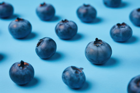 Fresh blueberries scattered on a light blue surface create a vibrant and appealing scene. Ideal for food photography, healthy eating themes, or culinary inspiration.