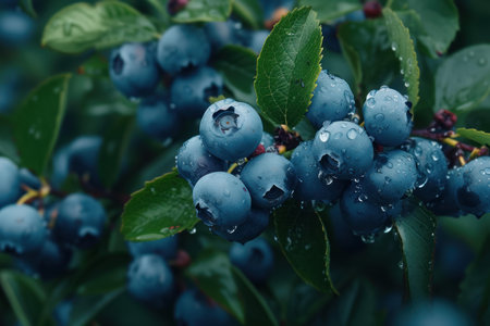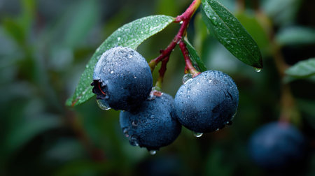 Ripe blueberries glistening with raindrops on a lush branch in nature.