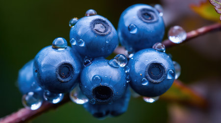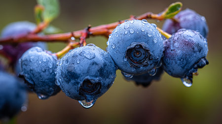 Fresh blueberries glistening with dew drops on a branch in nature.