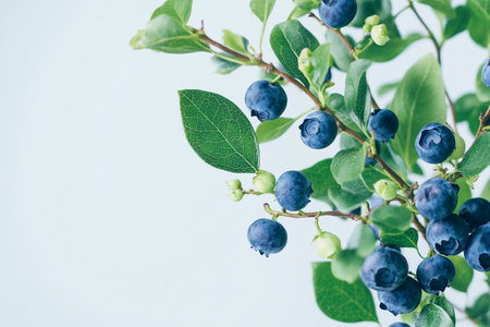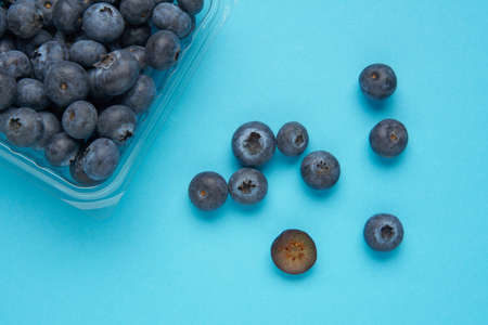 A view from above on delicious and juicy blueberries on a light blue background. Tasteful, raw and ripe blueberries full of vitamins. Organic ingredients for nutritious summer desserts.