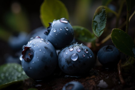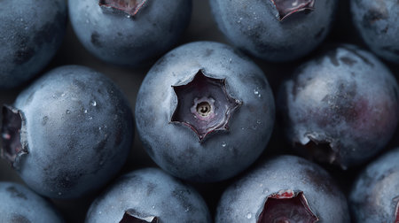 This image presents a close-up of fresh blueberries, displaying a vibrant blue color and spherical shape. Water droplets cling to the berries, enhancing the texture and suggesting freshness. The composition, lit with soft lighting, may be suitable for illustrating food-related themes or health content. It could be useful for commercial purposes.