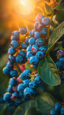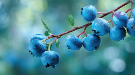 A close-up view of fresh blueberries on a branch, glistening with water droplets. This image captures the vibrant colors and soft bokeh background perfect for nature and food themes.