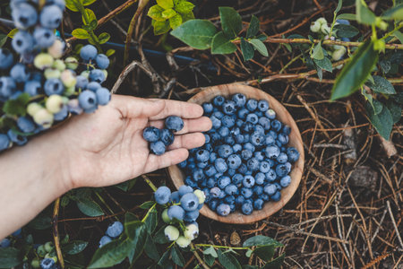 Blueberry farm with bunch of ripe fruits on tree during harvest season in Izmir, Turkey. Blueberry picking history.