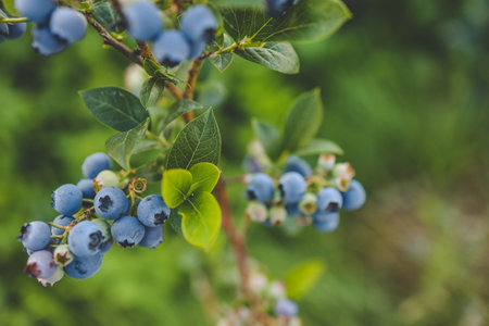 Ripe blueberry cluster on a blueberry bush in ukrainian garden