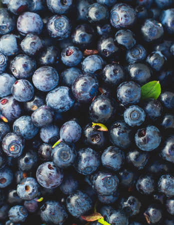 Pile of fresh ripe blueberries. Vegan and vegetarian and healthy dessert or snack concept. Background with macro texture of blueberry berries. Top view, selective focus, closeup