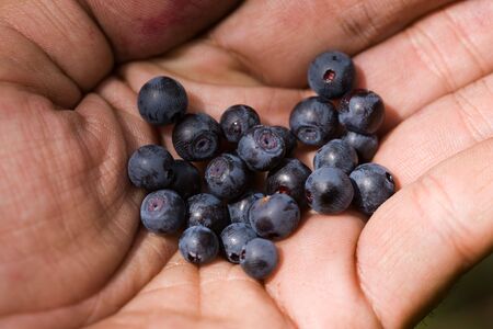 Blueberry picking, hands and juicy berry top view.