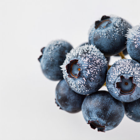 Fresh blueberries dusted with frost, showing a vibrant blue hue and texture.